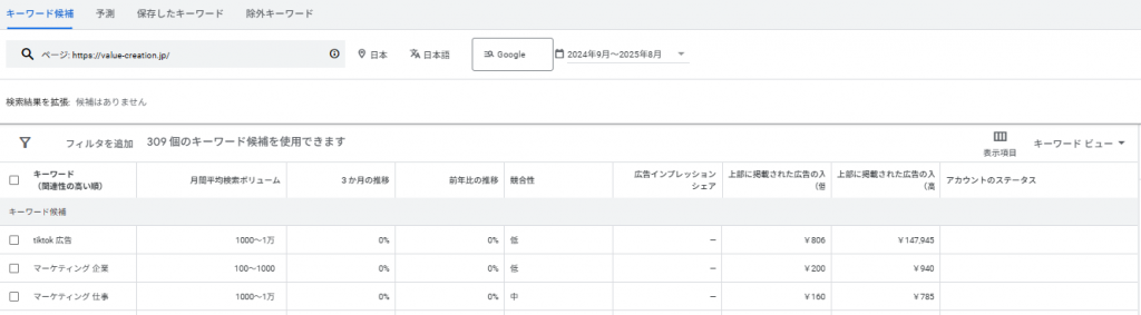 手順通り進んでいただき、URLを入れていただくとキーワードの候補、検索ボリューム、入札価格を確認することができます。