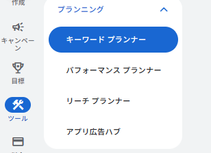 手順としてはツールタブよりプランニングの中にキーワードプランナーがあります。