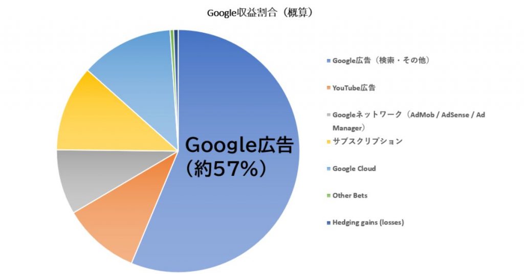 その根拠はGoogleの収益構造にあります。Googleの親会社、アルファベット社の2024年通期の収益情報によると全体の50%以上が検索広告をはじめとするGoogle広告からの収益と示されています。(YouTube広告は除く)